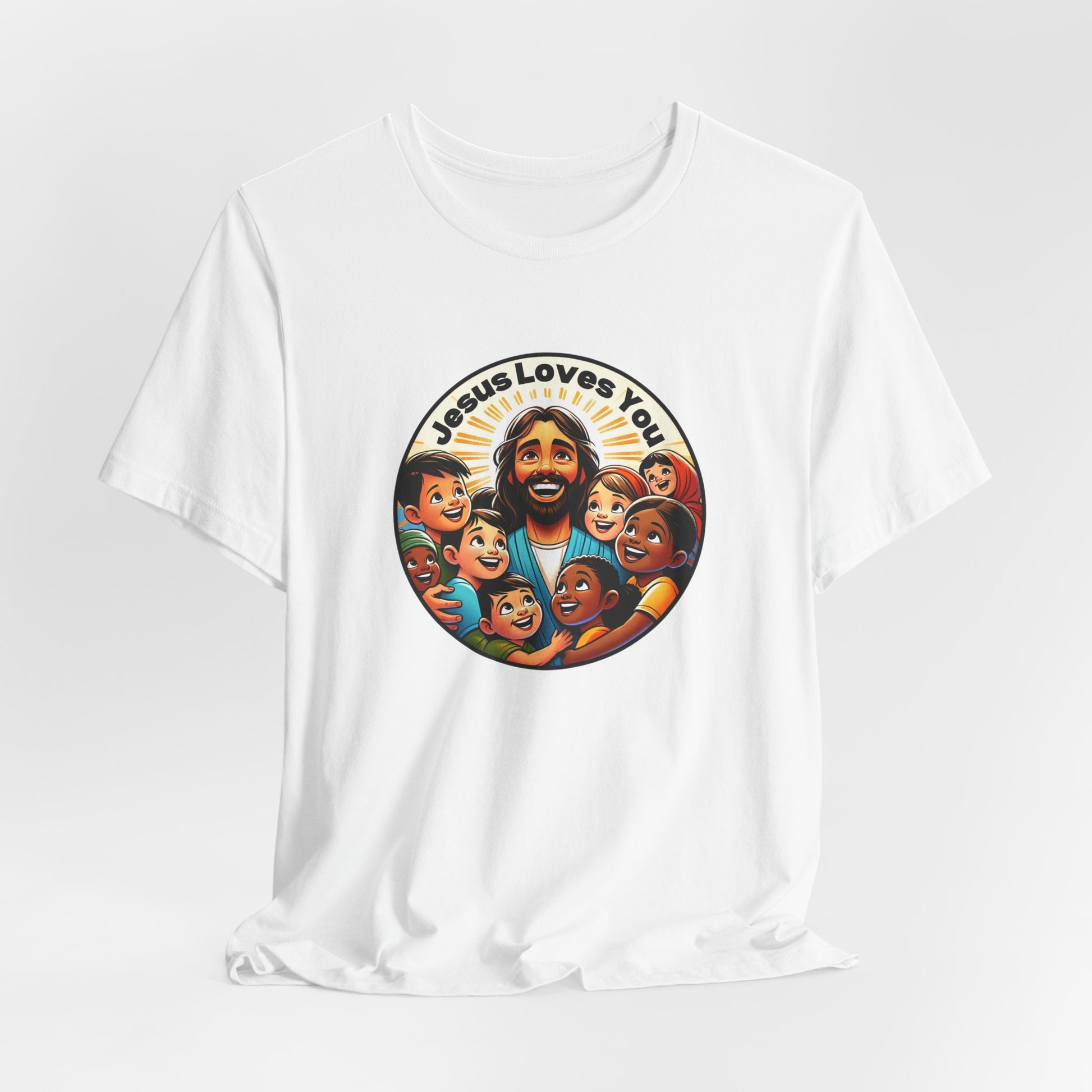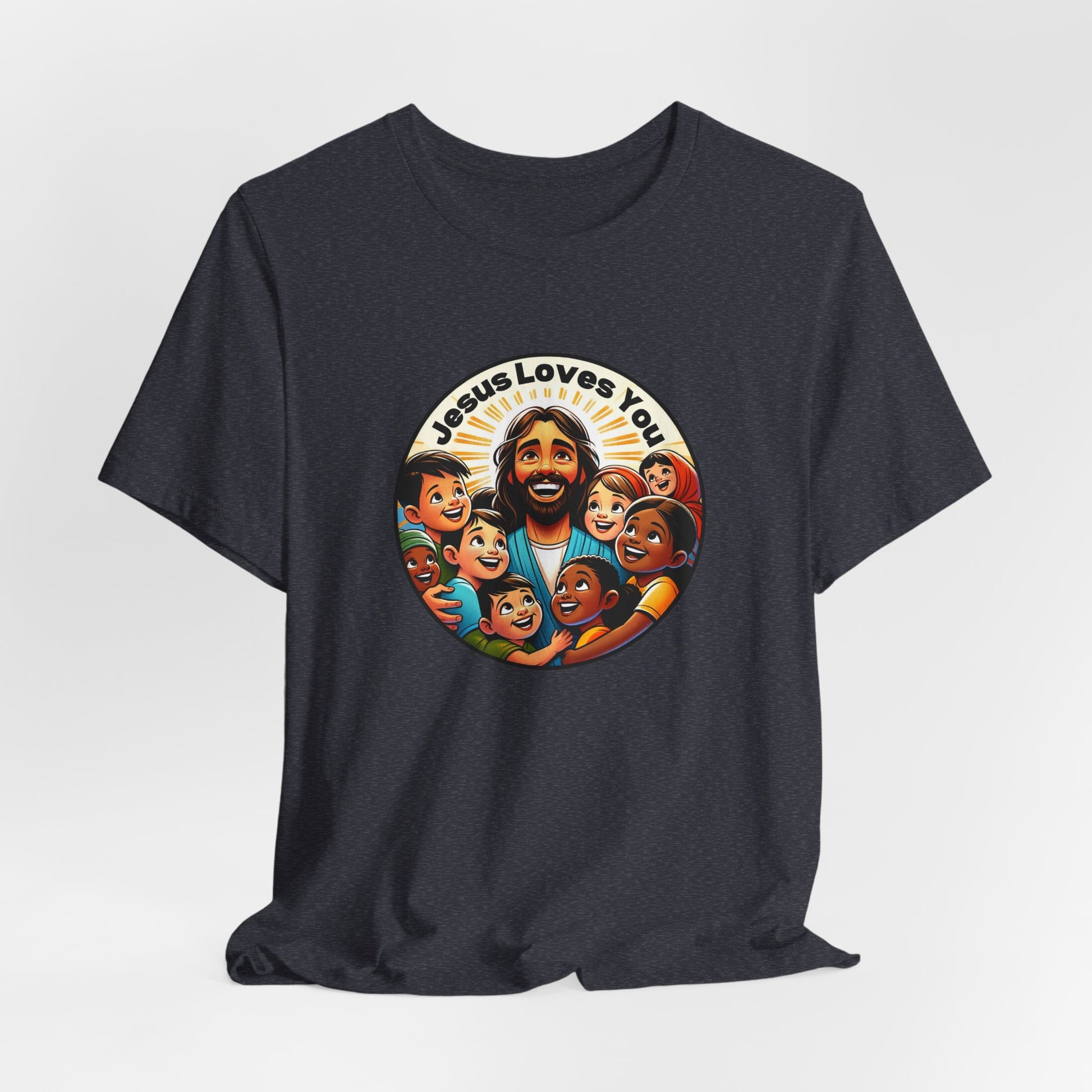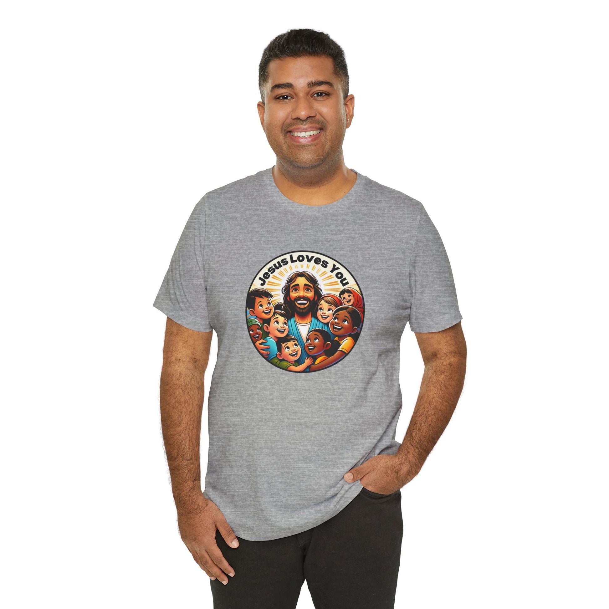 Perfect for Missions and Missionaries! Enhance your wardrobe with our "Jesus Loves You" men's t-shirt, a bold testament to faith and love. This distinctively designed tee showcases Jesus among multicultural children, symbolizing inclusivity and Jesus's universal love. Made with premium cotton, it offers both comfort and durability, making it an ideal choice for men to confidently express and share their faith. 🕊️🙌💕