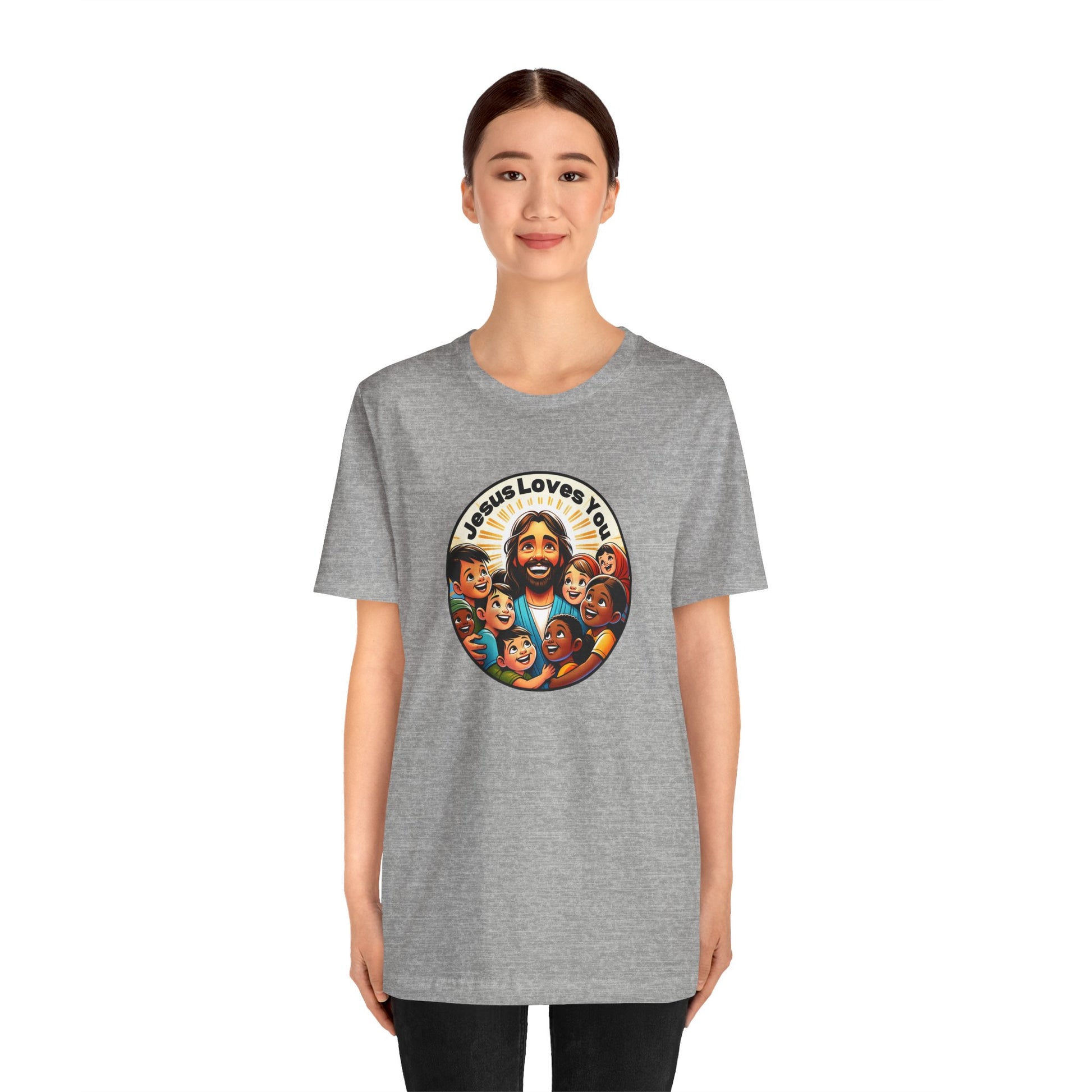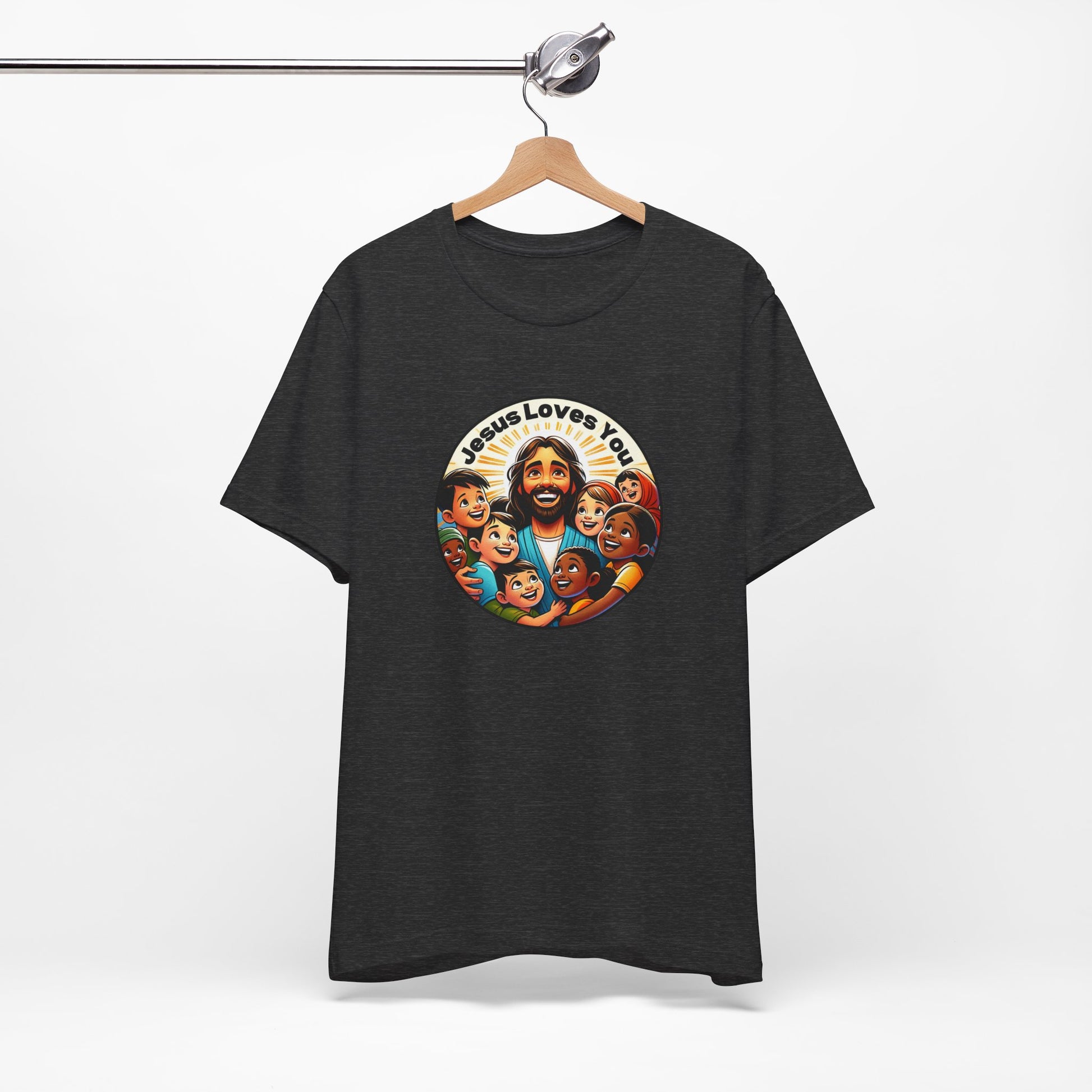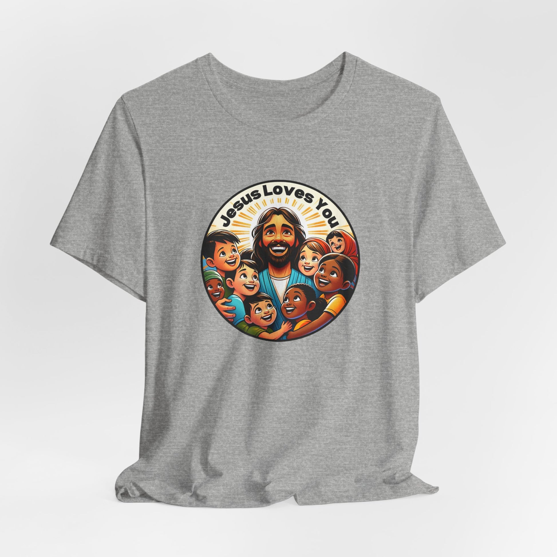 Perfect for Missions and Missionaries! Enhance your wardrobe with our "Jesus Loves You" men's t-shirt, a bold testament to faith and love. This distinctively designed tee showcases Jesus among multicultural children, symbolizing inclusivity and Jesus's universal love. Made with premium cotton, it offers both comfort and durability, making it an ideal choice for men to confidently express and share their faith. 🕊️🙌💕